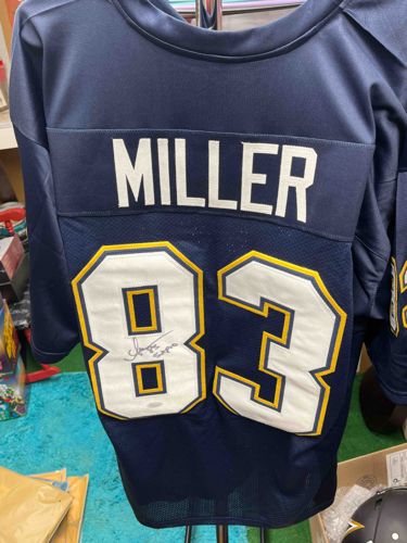 This is a navy blue mesh football jersey featuring the name 'MILLER' and the number '83' in a multi-layered tackle twill application. The primary numbers are white with a double border of navy and athletic gold. The jersey construction utilizes a heavy polyester mesh body for breathability with solid fabric paneling across the shoulders and yoke. A significant feature is the silver ink signature located on the number '8' on the back, appearing to be that of former Pittsburgh Steelers tight end Heath Miller. Below the signature on the white tackle twill is a small oval holographic authentication sticker. The item appears to be in good pre-owned condition, though some minor pilling is visible on the navy mesh just above the number '8'. The stitching on the nameplate and numbers shows standard retail-grade quality. No major stains, tears, or significant fading are immediately apparent from the rear view. The style corresponds to the early to mid-2000s era of professional football fan apparel. The signature is clear and legible against the white background of the jersey numbering.