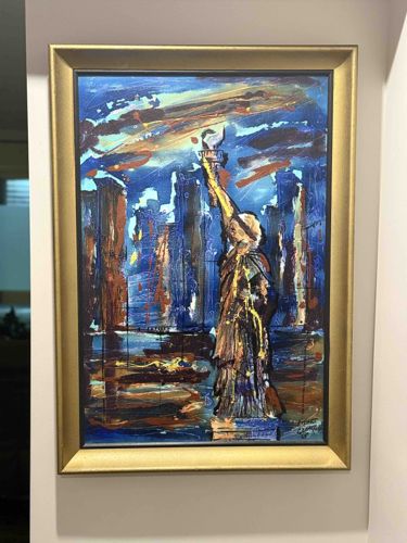 This is an original mid-century expressive oil or acrylic painting on canvas measuring approximately 29 by 41 inches, created by the artist Robert George in 1965. The composition features a bold, abstracted depiction of the Statue of Liberty in the foreground with the New York City skyline rising in the background. The artwork is characterized by energetic, impasto brushwork and a vibrant palette dominated by deep ultramarine blues, copper oranges, and golden ochre. The application of paint is thick and gestural, suggesting movement and a nocturnal atmosphere through the use of high-contrast highlights. The artist's signature 'Robert George' and the date '65' are visible in the lower right quadrant. The piece is housed in a contemporary fluted gold-toned wooden frame with a black inner liner that provides a classic contrast to the modern style of the painting. The canvas appears to be in good structural condition with no major visible punctures or tears, though some surface dust and minor age-related crazing of the paint layer may be present upon close physical inspection. The craftsmanship reflects the popular mid-century modern aesthetic of the 1960s, favoring emotional atmosphere over photographic realism.