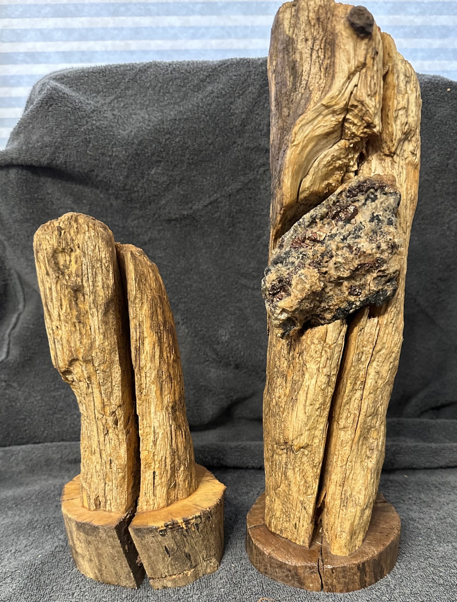 This pair of decorative pieces consists of vertically mounted, weathered wood fragments, one of which features a natural mineral inclusion. The primary specimen on the right stands taller and is characterized by its light, honey-colored wood with deep vertical graining and natural fissures. Embedded within its center is a large, rough-hewn metamorphic host rock containing visible crystals, likely almandine garnets, characterized by their dark red to brownish-black hue and isometric crystal structure. The wood shows signs of natural aging with a dry, matte patina and lacks any synthetic varnish. The smaller piece on the left complements the pair, exhibiting similar deeply striated bark-free wood with a vertical split that mimics the taller piece's form. Both pieces are mounted on circular, cross-cut wood bases that have been sanded but remain simple in construction. There are no visible maker's marks, suggesting these are artisanal or ‘found-object’ folk art creations, likely from the late 20th or early 21st century. The condition appears stable, though the wood exhibits natural desiccation cracks and some fraying at the edges which is consistent with the organic, rustic aesthetic. The mounting method appears to be a direct insertion or pin mount, emphasizing the raw, unrefined beauty of the materials.