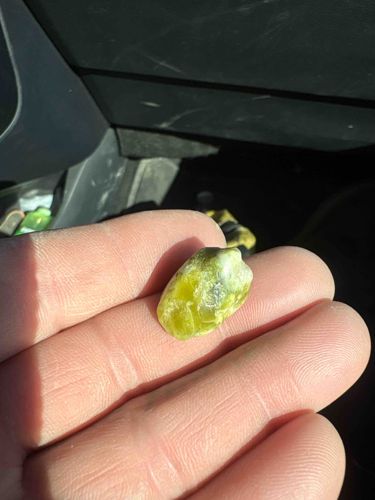 This item is a small, irregular specimen of a mineral, likely Vesuvianite, also known as Idocrase. Measuring approximately 1 to 1.5 centimeters in length, the stone exhibits a vibrant yellowish-green hue, characteristic of magnesium and iron-rich silicate minerals. The physical construction is naturally crystalline but appears somewhat water-worn or tumbled, resulting in a waxy to vitreous luster on its outer surface. The color varies from a translucent lemon yellow to a deeper olive green, with internal fractures and inclusions visible. These inclusions and the specimen's translucent nature are key quality indicators, suggesting it is a semi-precious gemstone material rather than common rock. There are no man-made markings, signatures, or stamps, as the item is a raw geological sample. The condition shows natural pitting and micro-fractures, typical for a raw specimen found in the field. This material is often associated with skarn deposits and metamorphic rocks. The craftsmanship is entirely organic, dictated by geological forces over millions of years, making it a unique natural artifact suitable for mineral collecting or lapidary use.