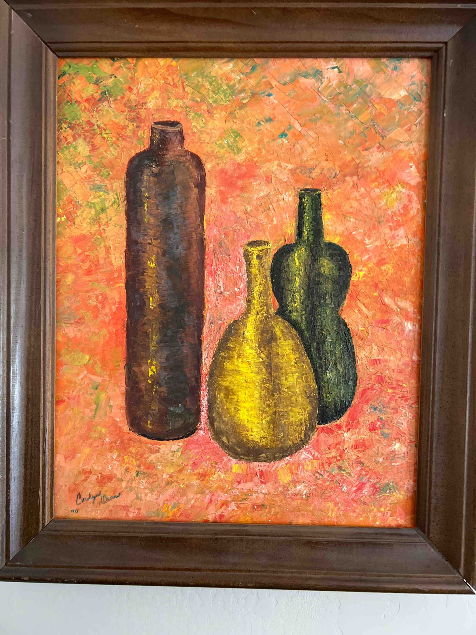This is an original mid-century modern still life oil painting on canvas or board, dated 1970. The composition features three stylized ceramic vessels—a tall dark brown cylindrical bottle, a central bulbous yellow vase, and a contoured dark green vessel—resting against a vibrantly textured, Impressionist-style background dominated by orange, coral, and hints of green and yellow. The artist utilized a heavy impasto technique, applying thick layers of paint with a palette knife or brush to create a rich, tactile surface that adds depth and movement. In the lower-left corner, the piece is hand-signed 'Carolyn Deans' with the year '70' inscribed below. The painting is housed in a period-correct, dark wood bevelled frame that enhances its mid-century aesthetic. The condition appears to be excellent for its age, showing no visible signs of flaking, cracking, or major restoration, though there is a natural aged patina to the wood frame and some minor dust accumulation. The color saturation remains high, indicating proper storage away from direct UV light. The craftsmanship reflects a confident use of color theory and texture typical of late 20th-century regional American art.