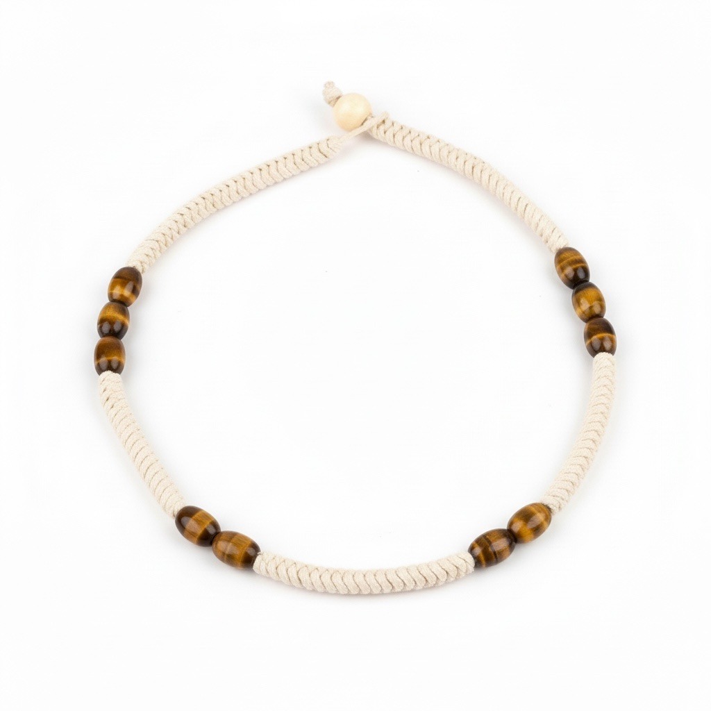 Braided Cotton and Tiger's Eye Bead Necklace with Wood Bead Closure