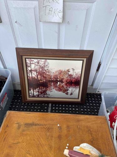 This item is a large-format mirrored wall art piece featuring a panoramic autumn landscape. The artwork depicts a serene lakeside scene with dense foliage and trees reflecting onto the water's surface. The color palette is dominated by sepia tones and reddish-brown hues, characteristic of infrared or color-filtered photography popular in late 20th-century home decor. The image is printed directly onto a mirror substrate, giving the piece a luminous, reflective quality that shifts with ambient light. This technique provides depth and dimension as the background reflects the viewer's room. The artwork is housed in a substantial beveled wood frame with a dark walnut-style finish, complemented by an inner linen-textured or off-white composite border (matting). Physically, the piece appears to be rectangular, approximately 24 to 30 inches in width. The construction is typical of mass-produced interior wall hangings from the 1970s or 1980s. While no specific artist's signature or maker's mark is visible from the front, pieces of this style were frequently produced by companies like Turner Mfg. Co. or Home Interiors & Gifts. The condition appears fair, with no visible cracks in the glass, though the frame shows light dust accumulation and the 'Please Take' sign above suggests it has been discarded or moved for donation. The craftsmanship is consistent with middle-market decorative art of its era, designed for durability and accessibility.