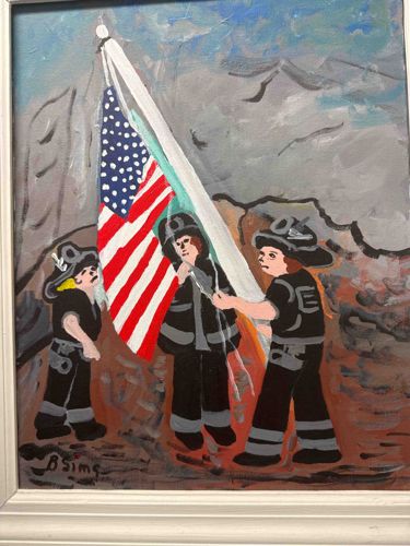 Folk Art Painting of Firefighters Raising the American Flag at Ground Zero