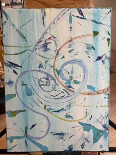 This is an original contemporary abstract painting executed on a vertically oriented rectangular canvas. The composition is defined by a central gestural spiral motif, featuring overlapping loops in varying shades of lavender, light blue, and ochre. The background consists of a washed white surface with vertical striations of pale blue, creating a sense of depth and movement. Surrounding the central spiral are energetic, multi-colored applications of paint, including dark purple, emerald green, and turquoise strokes, often applied with palette knives or broad brushes to create texture. The materials appear to be acrylic or oil paint on a stretched canvas support. Notable features include the juxtaposition of fluid, circular lines against sharp, jagged splatters of color. The condition appears to be excellent and newly executed, with no visible signs of cracking, yellowing, or structural damage to the canvas edges. There are no clearly visible maker's marks or signatures on the front of the work, suggesting it may be signed on the reverse. The style is characteristic of late 20th to early 21st-century lyric abstraction, focusing on spontaneous movement and color harmony rather than representational form. The craftsmanship is evident in the confident layering of pigments and the dynamic use of negative space.