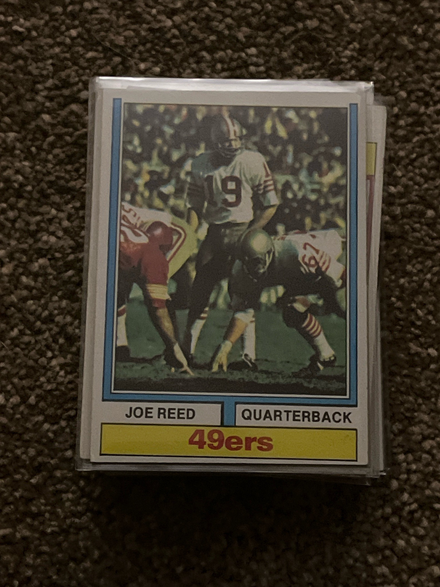 This is a vintage 1975 Topps football trading card featuring San Francisco 49ers quarterback Joe Reed. The card exhibits the signature 1975 design, which includes an inner blue border framing the player photograph and a distinct two-tone banner at the bottom. The bottom banner features the player's name and position ('JOE REED' and 'QUARTERBACK') in black text on a light gray background, situated above a larger yellow block containing the team name '49ers' in a red, sans-serif font. The photo depicts Reed in a classic action-pre-snap pose, wearing the characteristic 1970s era 49ers white away jersey with the number 19. Physically, the card is standard 2.5 by 3.5 inches and is made of typical cardstock of the era. Regarding condition, the centering appears relatively stable for the period, though the top border seems slightly thinner than the bottom. The corners show some softening, and the presence of a plastic protective sleeve suggests it has been cared for to prevent surface scratches. The print quality displays the typical grainy aesthetic of mid-70s mass production. This card is part of the 528-card set released by Topps in 1975, a pivotal year for NFL collectibles characterized by vibrant, multi-colored designs.