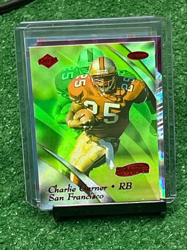This is a 2000 Playoff Prestige football card featuring Charlie Garner, a running back (RB) for the San Francisco 49ers. The card showcases a dynamic action shot of Garner in his gold and scarlet red uniform against a vibrant, lime-green holographic background with metallic refractor qualities. The card's aesthetic is typical of the early 2000s sports card design, utilizing 'Prestige' branding with stylized red logos in the corners and bottom. It is standard trading card size (roughly 2.5 by 3.5 inches) and is constructed from premium cardstock with a glossy finish. The card is currently protected within a clear soft sleeve inside a rigid top-loader, which sits on a display stand. From the visible image, the centering appears slightly off toward the left, and the edges seem relatively crisp with minimal whitening, though the top-loader has some surface scuffing. No major creases or surface defects are immediately visible on the card itself, indicating it has been well-preserved. This era of Playoff Prestige is known for its high-quality spectral effects and durable construction.