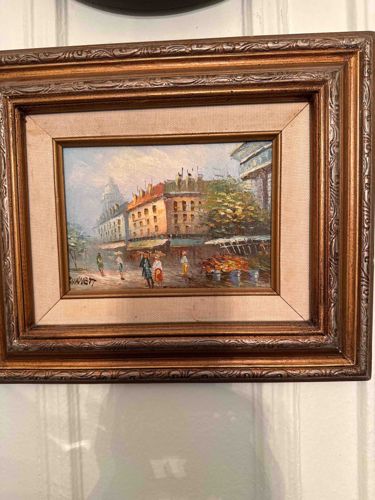 This is an original oil on canvas or board painting depicting a vibrant Parisian street scene, signed by the artist Burnett in the lower left corner. The artwork is executed in a late 20th-century impressionistic style, utilizing thick impasto brushstrokes that provide a textured, three-dimensional quality to the figures and architecture. The palette features warm ochres for the buildings, interspersed with pops of red and blue in the figures and market stalls. The composition focuses on a curved street lined with multi-story French architecture, leading the eye toward a domed structure in the hazy background, likely the Pantheon or Sacré-Cœur. The painting is housed in an ornate, multi-tiered gilded wood frame with a linen liner. The frame shows decorative scrolling and bead-and-reel motifs in a bronze-gold finish. Condition-wise, the artwork appears well-preserved with no visible cracking or flaking of the paint. The linen liner shows minor age-related discoloration and dust accumulation, typical for pieces from the mid-to-late 20th century. Caroline Burnett was a prolific American artist who lived and worked in France; her work is characterized by these quintessential scenes of daily Parisian life, often sold to international tourists.