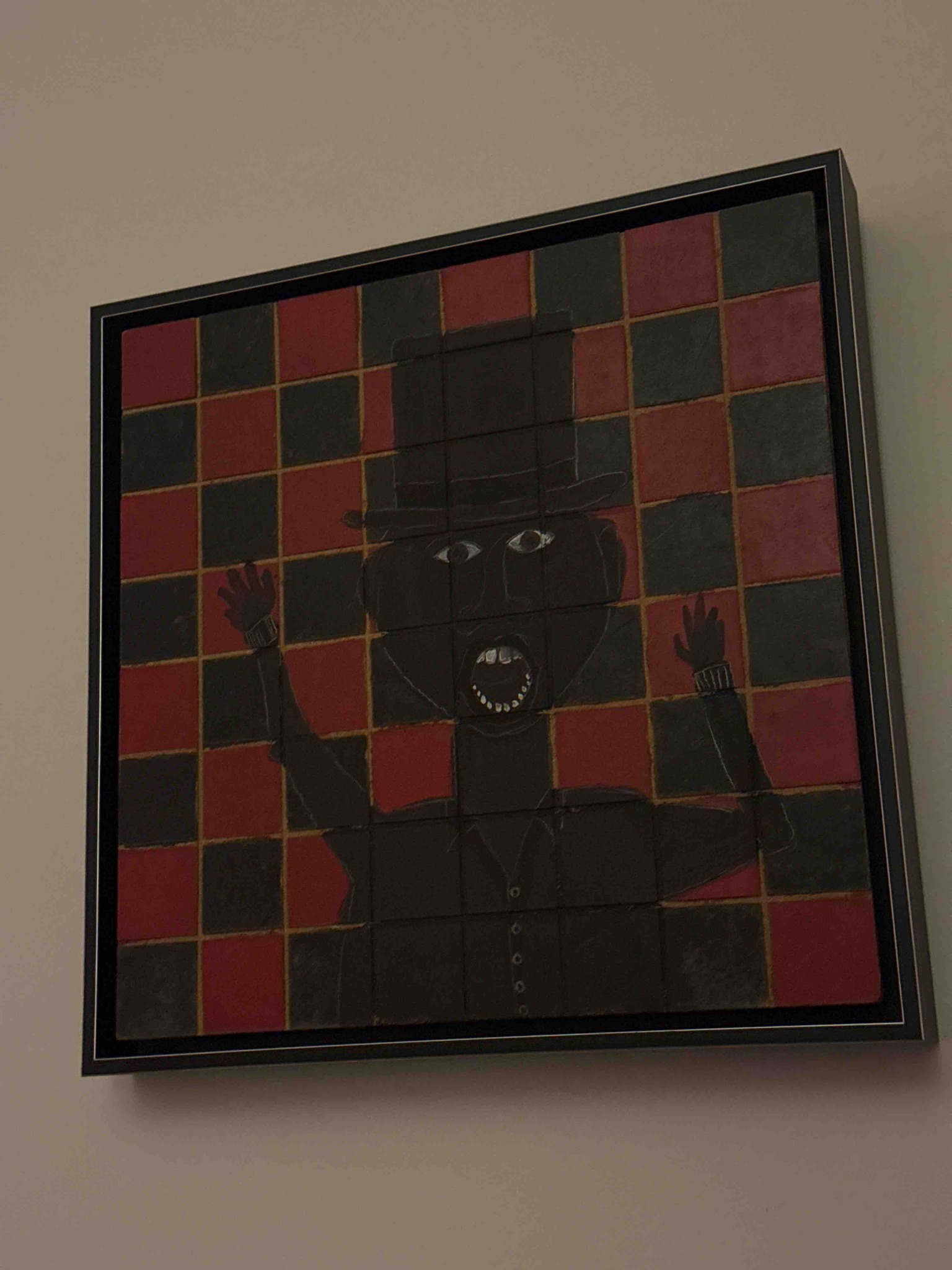 This contemporary artwork features a stylized silhouette of a figure wearing a top hat, rendered in deep black against a geometric checkered background of alternating red and charcoal grey squares. The surface of the work is notably divided into a visible 8x8 grid of square tiles or sections, creating a modular aesthetic with subtle grout-like lines in a golden-brown tone separating each square. The central figure is depicted with wide, expressive white eyes and an open mouth revealing a row of individualized white teeth, suggesting a vocal or surprised expression. Small white highlights are also used to define buttons on the shirt and cuffs at the wrists. The piece is approximately square in shape and is housed in a modern black shallow-set floater frame with a thin silver-toned inner lip. The style appears to be a blend of folk art influence and urban contemporary expressionism. No overt signature is visible on the face of the work, but the craftsmanship suggests a deliberate play with texture and rhythm. The condition appears excellent with no visible scuffs, chips to the segments, or significant fading, indicating it is likely a 21st-century production.