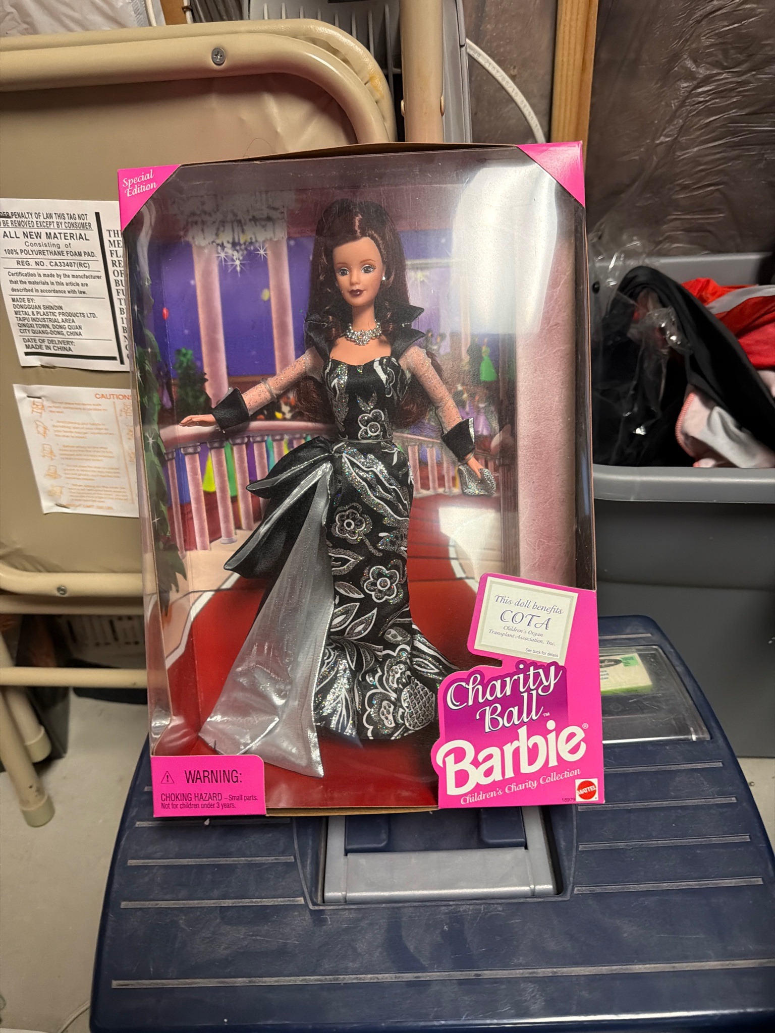 This is a 1997 Special Edition Barbie doll from the Children's Charity Collection, specifically marketed as 'Charity Ball Barbie' to benefit the Children's Organ Transplant Association (COTA). The doll features long, dark brunette hair styled in a half-up fashion and is dressed in a formal evening gown. The gown is a striking floor-length black sheath with intricate silver glitter floral and leaf patterns. It includes a dramatic silver satin side-bow and train, sheer shimmery sleeves, and fold-over black cuffs. Accessories include a faux diamond necklace, matching earrings, and a small silver clutch bag. The doll is presented in its original 'New in Box' (NIB) packaging, which features a ballroom balcony background. The box is predominantly pink with 'Special Edition' and 'COTA' branding visible. Notable condition aspects include some mild shelf wear on the cardboard corners and slight scuffing on the clear plastic display window, but the factory seals appear intact. The doll's craftsmanship is indicative of late-90s Mattel collector editions, emphasizing high-contrast textiles and glitter application. It remains a notable piece for collectors focusing on philanthropic partnerships or the 'Children's Charity Collection' series manufactured by Mattel.