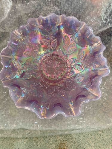 Fenton Holly Pattern Carnival Glass Ruffled Bowl in Amethyst