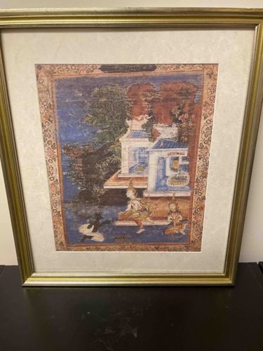 Framed Thai Temple Manuscript Painting on Cloth or Bark Paper