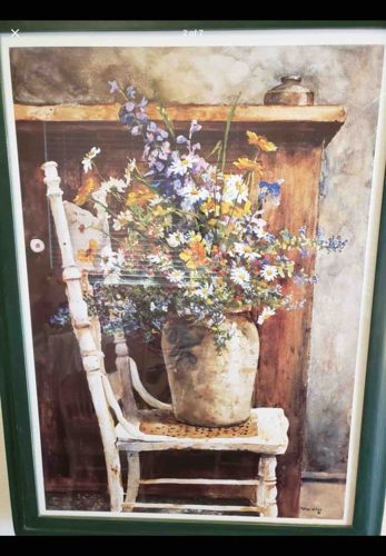 This is a framed art print depicting a rustic still life scene, commonly attributed to artist Marcia Wills. The composition features a large, overflowing bouquet of wildflowers including white daisies, yellow sunflowers, and purple larkspur or delphiniums. The flowers are arranged in a large, unglazed or matte-finished stoneware crock or jug sitting atop a white, spindle-back wooden chair with a visible rush or light-colored seat. The background consists of dark wooden paneling or furniture and a stone-textured wall, creating a country-cottage aesthetic. The artwork is rendered in a soft, impressionistic style with a palette of whites, earthy browns, blues, and yellows. The print is housed behind glass in a simple, dark green frame. The signature 'Marcia Wills' is visible in the lower right-hand corner. Regarding condition, the frame appears intact with minor surface wear, and the print displays some noticeable light reflections across the center, though the paper itself seems well-preserved without visible foxing or water damage. This style is characteristic of late 20th-century decorative interior art, likely produced between the 1980s and 1990s as a high-quality lithograph or mass-produced art print for home decor markets.