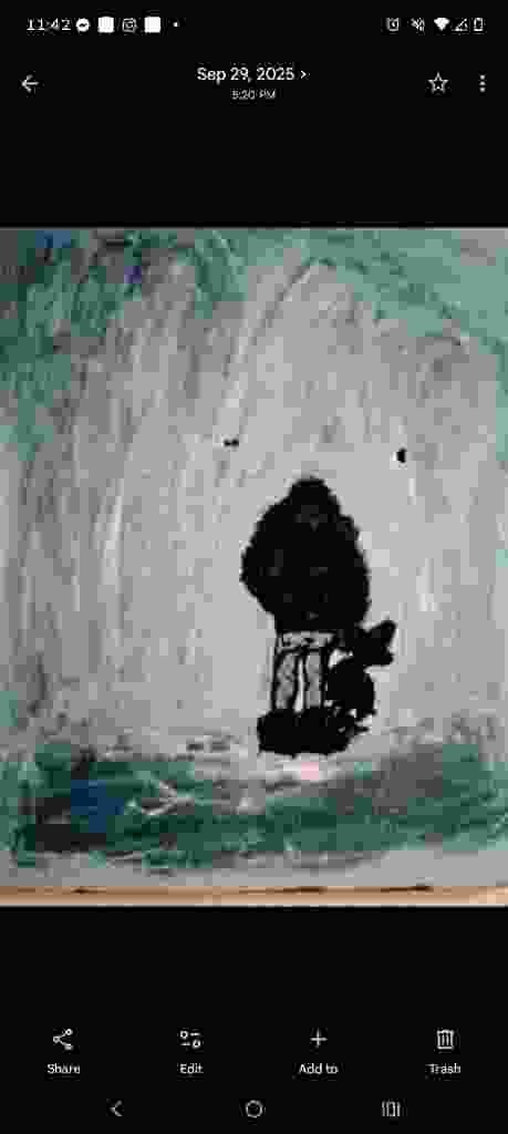 This artwork is a mixed-media vertical composition, likely utilizing watercolor or gouache for the background with ink or thick acrylic for the central figures. The piece features a central, heavily stylized black silhouette of a figure standing beside a smaller, seated figure or animal, possibly a dog. The background is rendered in a soft, atmospheric palette of pale greens, grays, and whites, suggesting a misty or wooded environment. The lower foreground contains horizontal brushstrokes of deep forest green and teal, indicating grass or water. The artwork appears to be created on heavy paper or cardstock, with visible deckled edges or slight warping at the bottom margin. The application of paint in the background is loose and wash-like, while the central dark figures are dense and opaque, creating a high-contrast focal point. Due to the digital image quality, specific maker's marks or signatures are not immediately visible. The style suggests a contemporary folk-art influence or illustrative character study, possibly from the late 20th or early 21st century. The condition appears to be relatively good with no major losses or staining, though the paper shows slight undulation. The overall craftsmanship displays a deliberate use of negative space and atmospheric perspective to convey mood.