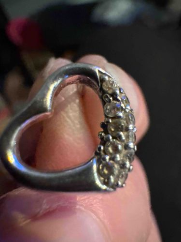 This item is an asymmetrical, heart-shaped pendant featuring an openwork frame. It appears to be constructed from a white-toned metal, likely sterling silver or a base metal with silver plating, though no hallmark is visible in the provided image. One side of the heart is smooth and polished, while the opposing rounded lobe is set with two rows of small, round-cut clear stones in a pavé or shared-prong setting style. The stones exhibit a yellowish tint, which may indicate they are lower-grade diamonds, cubic zirconia, or crystals that have accumulated surface grime and skin oils over time. The pendant measures approximately 15mm-20mm in height. Notable condition issues include significant tarnishing on the inner curve and back of the setting, indicating metal oxidation typical of silver-bearing alloys. There are visible surface scratches and 'flea bites' consistent with regular wear. The craftsmanship appears to be mass-produced contemporary style, likely dating from the late 20th to early 21st century. The overall condition is fair to good, requiring professional cleaning and polishing to restore its luster and ensure the integrity of the stone settings.