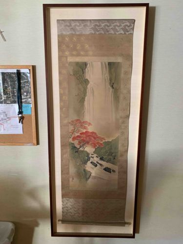 Framed Antique Japanese Kakejiku (Hanging Scroll) featuring a Waterfall Landscape