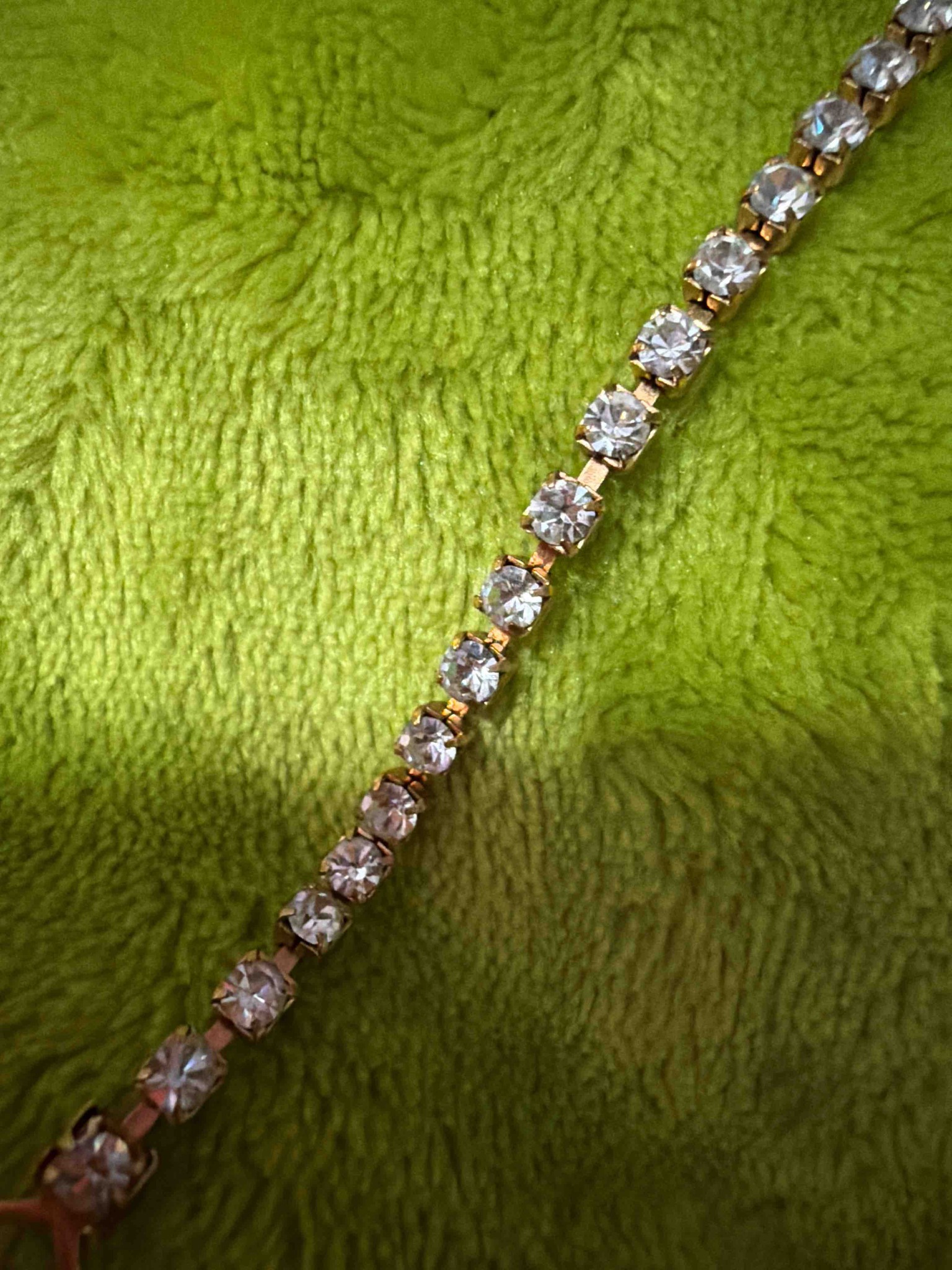 This item is a linear, flexible 'tennis' style bracelet construction featuring a continuous row of circular-cut colorless stones. Each stone is individually housed in a four-prong square-shaped setting, likely composed of an unspecified base metal with a yellow gold-toned plating. The stones exhibit characteristics consistent with glass rhinestones or cubic zirconia, given their high surface reflection and visible facet patterns. The bracelet segments are joined by small metal bar links that allow for fluid movement. The yellow-gold finish shows some light tonal variations, common with vintage costume jewelry. The overall craftsmanship suggests a mass-produced fashion piece rather than fine jewelry, as evidenced by the simple prong-over-stone assembly and the lack of precision in the metal edges. Based on the construction style and settings, the piece likely dates from the late 20th century to early 21st century. Condition appears fair to good; the stones are present, though the metal plating shows minor signs of potential oxidation or wear near the connection points. No visible maker's marks or stamps are identifiable in the current viewing angle.