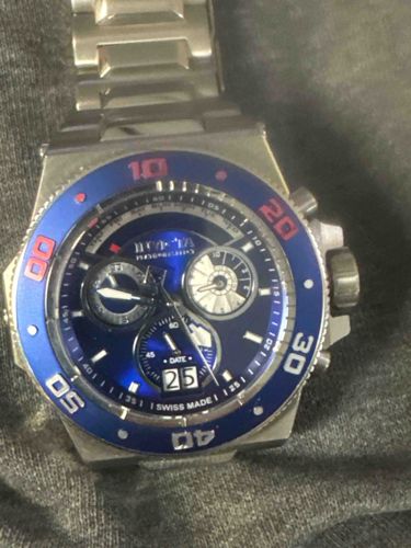 This is a large-format Invicta Reserve Subaqua Specialty men's chronograph watch. The timepiece features a robust stainless steel construction with a brushed finish on the case and a multi-link integrated bracelet. The dial is a deep metallic blue sunray finish, protected by a flame-fusion crystal. It includes three sub-dials (day of the week, 30-minute counter, and constant seconds) along with a double-digit 'Big Date' aperture at the 6 o'clock position. The fixed or unidirectional bezel is a vibrant blue with embossed Arabic numerals in silver and red highlighting at the 10 and 20 marks. Marked 'SWISS MADE' at the bottom of the dial, implying a Swiss quartz movement. The watch features oversized pushers and a large screw-down crown with a protective guard typical of the Subaqua line. Condition appears to be used but good; there is visible surface scratching and 'desk diving' marks on the stainless steel bezel edges and lugs, though the crystal seems clear of major chips in this view. The watch dates to the modern era, likely within the last 10-15 years, and is characterized by Invicta's signature heavy, oversized aesthetic and complex dial layering.