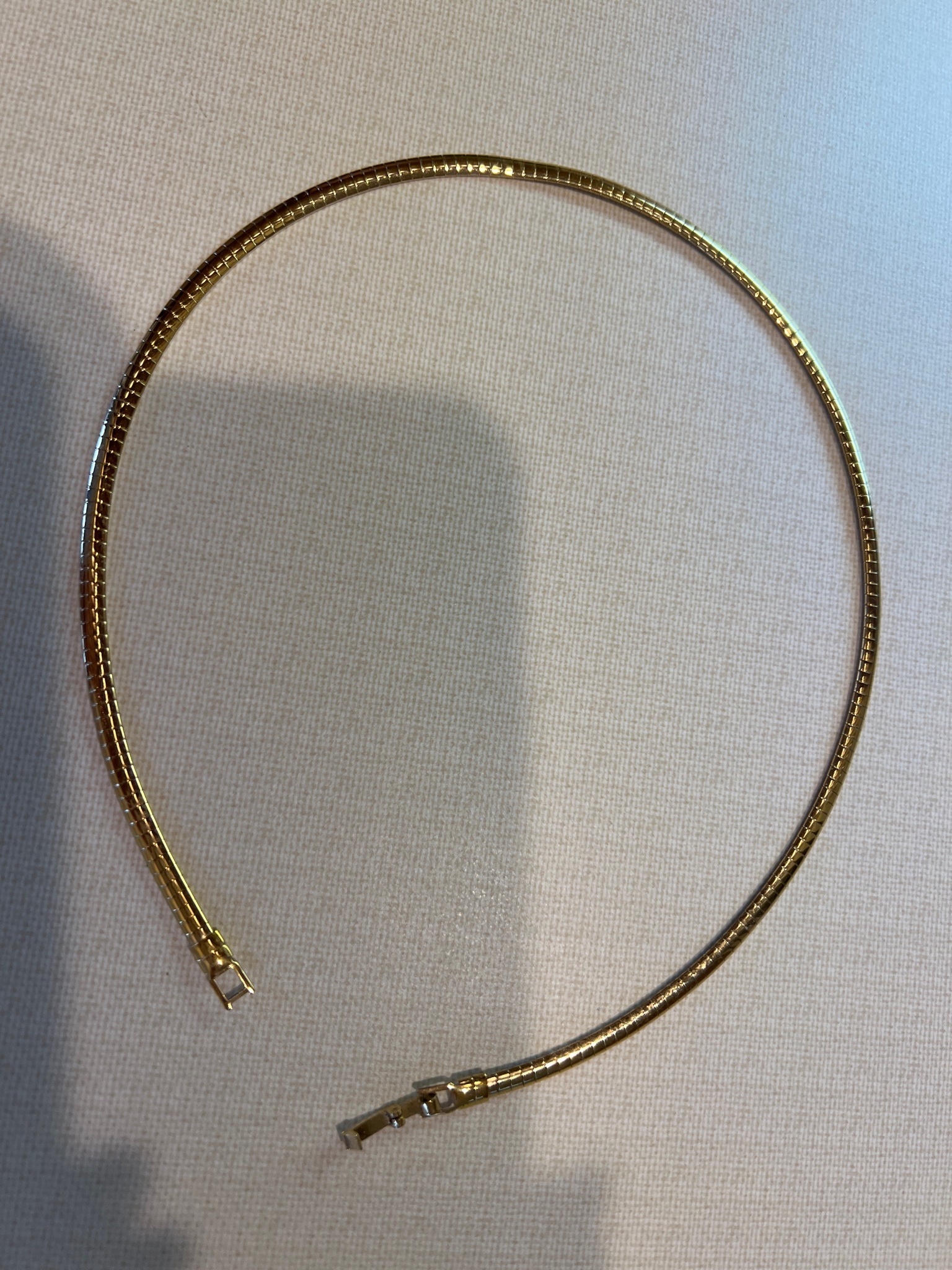 This is a yellow gold Omega-style choker necklace, characterized by its semi-rigid, high-polish structure. The piece is constructed of small, interlocking rectangular metal plates or scales that are closely aligned to create a smooth, continuous surface that maintains a circular or 'c-shaped' form on the neck. It features a bright, reflective yellow gold finish, likely 14k or 18k gold or high-quality gold plating. The necklace is approximately 16 to 18 inches in length with a width of roughly 3mm to 5mm. It is fitted with a box clasp and safety latch for secure closure. The overall condition appears to be very good with a bright luster; however, there is a visible slight kink or irregularity in the curvature on the bottom-right side, which is common in Omega chains if they are bent beyond their structural limit. The craftsmanship displays high precision, with each segment fitting tightly to its neighbor. This style peaked in popularity during the late 20th century, specifically the 1980s and 1990s, and is prized for its sleek, modernist aesthetic and the way it sits flat against the collarbone.