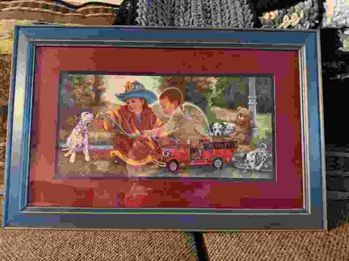 This is a framed art print featuring a nostalgic illustration by renowned Americana artist Donald Zolan. The artwork depicts two young children playing 'firefighter' outdoors; a girl wears a large blue firefighter's hat and brown coat, while a boy kneeling beside her wears wings, suggesting a guardian angel theme. They are accompanied by several dalmatian puppies and a vintage-style red fire truck toy. The scene is rendered in Zolan's signature soft-focus, sentimental style with vibrant warm tones. The print is professionally mounted within a double-matted frame, featuring a wide burgundy or deep red inner mat and a secondary black border. The external frame is a classic beveled wood or composite molding finished in a dark slate blue with subtle metallic silver gilding on the inner lip. The overall construction appears to be high-quality decorative wall art from the late 20th century, likely the 1990s. While no signature is visible in this low-resolution image, Zolan's work is typically marked in the plate or hand-signed in some editions. The condition appears fair to good, with some minor scuffing visible on the frame corners and potential dust accumulation on the glass surface. The backing is likely sealed with paper to prevent acidic damage to the print.