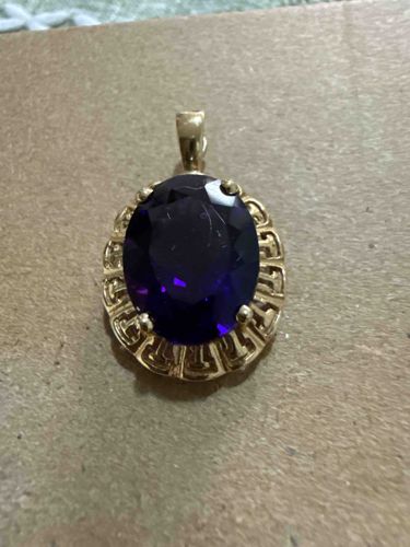 This jewelry piece consists of a large, oval-cut amethyst gemstone prominently set within a yellow gold pendant frame. The central amethyst displays a deep, royal purple saturation with visible violet flashes, characteristic of high-quality quartz specimens. The gemstone is secured by four substantial gold prongs. Surrounding the center stone is an openwork gallery featuring a classic 'Greek Key' or meander motif, which adds a neo-classical aesthetic to the design. The metal appears to be a polished 10k or 14k yellow gold based on the warm luster and common construction methods for this style. The pendant is topped with a simple, tapered gold bail for suspension on a chain. The amethyst shows several surface abrasions and minor scratches on the table facet, suggesting frequent wear or contact with harder materials. There is some slight discoloration in the recessed areas of the Greek Key pattern, likely from accumulated debris or minor oxidation. The overall craftsmanship suggests a late 20th-century mass-market fine jewelry production, likely dating between the 1980s and early 2000s when this specific combination of bold gemstones and geometric gold patterns was highly popular.