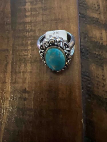 This item is a statement-style ring featuring a prominent oval-shaped turquoise cabochon center stone. The turquoise exhibits a vibrant medium-blue hue with naturally occurring golden-brown matrix inclusions scattered across its surface, suggesting it is a genuine stone. The cabochon is secured in a bezel setting and surrounded by a decorative, scalloped sterling silver (or silver-toned metal) halo. This halo features intricate scrollwork, filigree patterns, and beaded accents, typical of Southwestern or Bohemian jewelry designs. The ring shank appears wide and polished, providing substantial structural support for the large head. The metal shows a dark patina in the recessed areas of the ornate metalwork, which enhances the visual depth and contrast of the design. A retail tag is visible attached to the band, indicating the piece may be contemporary or recently offered for sale. The overall craftsmanship suggests a mass-produced but high-quality decorative piece, likely dating from the late 20th century to the present. Condition appears excellent with no visible chips to the stone or significant scratches to the metalwork.