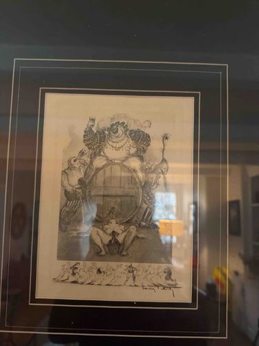 This is a framed pen and ink illustration on paper, identified by the signature at the bottom right as the work of artist Tony Ditril. The central composition features a large, seated Bacchic figure atop a barrel, surrounded by smaller attendant figures in a whimsical, satirical style reminiscent of 20th-century caricature art. Below the main scene is a decorative frieze of dancing silhouette-like figures. The artwork is monochromatic, utilizing fine line work and cross-hatching to create depth and texture. The paper shows slight yellowing, consistent with age, but the ink remains crisp. It is housed in an elaborate multi-layered professional mount featuring at least three decorative lines (French matting style) and a dark perimeter frame behind glass. The craftsmanship displays high-quality illustrative skill, with a focus on grotesque yet playful anatomy and dynamic composition. The style suggests mid-to-late 20th-century production. Condition appears good from the visual inspection, with no immediate signs of foxing or water damage, though some reflections on the protective glass obscure the finest details of the paper texture.