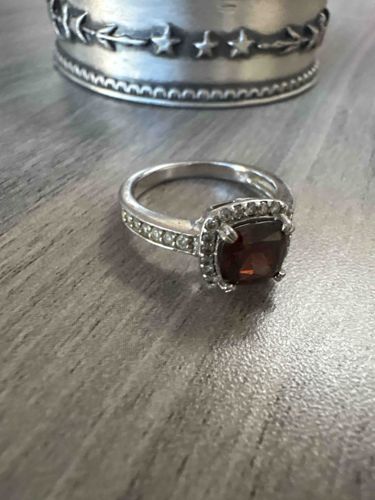 This item is a contemporary-style cocktail or engagement ring featuring a central cushion-cut gemstone, likely a natural almandine or pyrope garnet, exhibiting a deep brownish-red hue. The central stone is approximately 1.5 to 2 carats, secured by four double-claws. It is surrounded by a square-shaped 'halo' of small, round brilliant-cut colorless stones, which also extend down the shoulders of the band in a channel or pavé setting. The metal appears to be sterling silver or white gold, showing a high-polish finish with minor surface abrasions and light scratching consistent with regular wear. There is noticeable grime buildup around the gallery and under the prongs, which is common in pre-owned jewelry. The ring's construction suggests a modern manufacture, estimated from the 2000s to the present. The craftsmanship shows standard commercial quality, with symmetrical stone placement and a solid shank. No visible hallmarks are clear from the image, though a faint inscription is visible on the interior band surface that likely indicates metal purity (e.g., '925' or '14K'). In the background is a pewter or silver napkin ring or candle holder with celestial star and moon motifs, providing a scale reference.