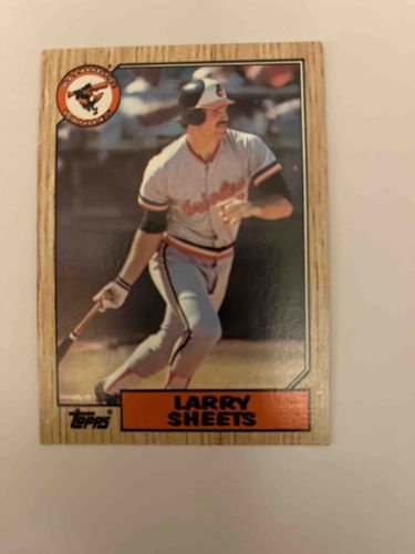 This is a standard 2.5 by 3.5 inch vintage baseball card from the 1987 Topps series, featuring Larry Sheets of the Baltimore Orioles. The card is instantly recognizable by its signature faux-wood grain border, a hallmark design element of the 1987 Topps set. The front of the card displays a dynamic action shot of Sheets in a batting stance, wearing the classic orange and black Orioles away uniform. Key design elements include a circular team logo in the top left corner, the 'Topps' brand logo in the bottom left, and an orange name block at the bottom right. The card is printed on semi-glossy heavy paper stock. In terms of condition, the centering appears slightly off, shifted toward the right margin. The corners show visible wear and minor softening, particularly at the top left. The edges exhibit slight chipping common with this wood-grain pattern. There is a visible horizontal surface scratch or print line near the bottom area across the player's legs. The colors remain relatively vibrant without significant fading. This card represents a popular 'junk wax' era collectible from the late 1980s, noted for its nostalgic aesthetic but high production volume.