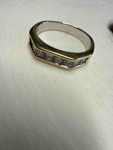 This is an elegant contemporary-style band crafted in 14k gold, featuring a sophisticated two-tone design. The exterior of the shank exhibits a warm yellow gold finish, while the interior and the setting channel appear to be white gold or rhodium-plated, creating a high-contrast aesthetic. The ring is set with seven princess-cut (square) diamonds, which are flush-mounted within a secure channel setting along the top half of the band. The diamonds appear to be of consistent size and clarity from the visual perspective, though they show significant surface dirt and skin oil accumulation that currently dulls their brilliance. The band features a flat top profile with slightly beveled edges and a tapered shank for comfortable wear. Notable condition issues include a heavy patina of fine scratches consistent with regular daily wear (surface marring) on the yellow gold surfaces and some thinning of any rhodium plating. Inside the shank, a standard '14K' hallmark is partially visible, indicating gold purity. The craftsmanship is of retail jewelry quality, likely late 20th to early 21st century in origin. A professional ultrasonic cleaning and light polishing would significantly improve the luster of the metal and the fire of the gemstones.