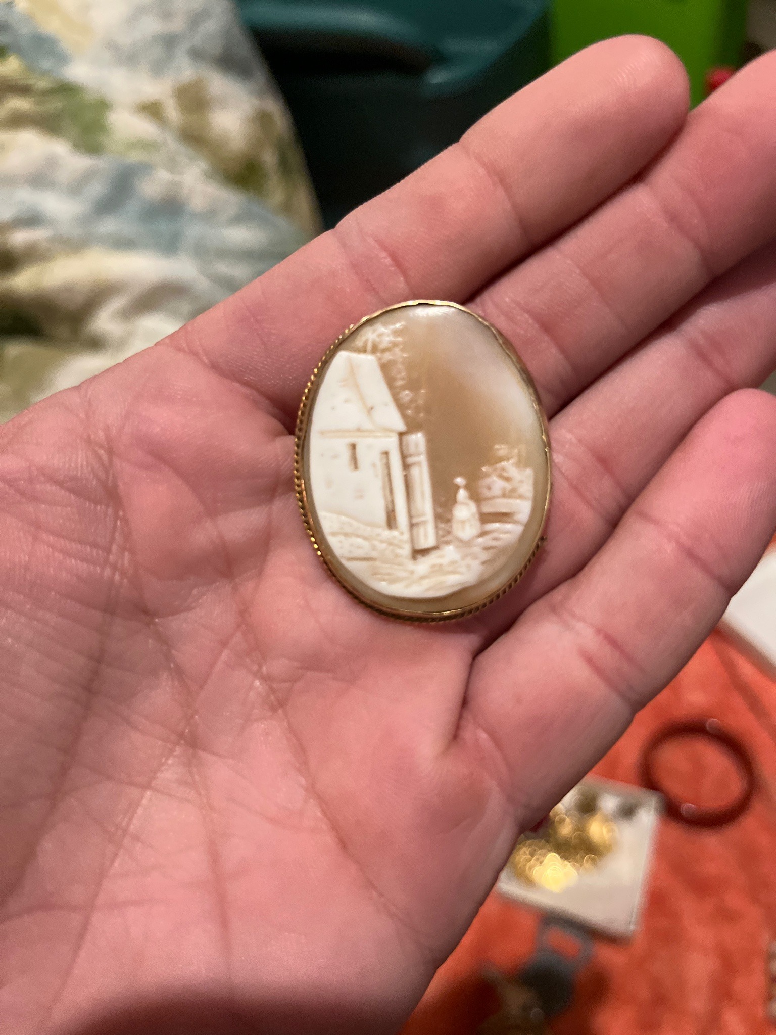 This is an oval-shaped carved shell cameo brooch, approximately 35mm to 40mm in height, featuring a detailed 'scenic' or 'village' motif rather than the traditional portrait. The carving is executed on a natural conch or sardonyx shell, utilizing the light-colored upper layer to create the raised (bas-relief) imagery against a warm, brownish-tan background. The scene depicts a tall cottage or structure with a steep roof, a person standing in the foreground, and foliage in the distance. The cameo is securely held in an elegant, gold-toned bezel frame that features a fine twisted rope border, a common design element in mid-20th-century jewelry. The craftsmanship of the carving shows varying depths, providing a three-dimensional perspective to the architectural elements. Regarding condition, the shell appears largely intact with some visible fine surface scratches and minor 'stress lines' or internal crazing consistent with natural shell aging. The gold-toned metal frame shows light patina but no major structural damage or missing sections. Based on the carving style and frame construction, this piece likely dates from the late 1930s to the 1960s, a period when shell cameos from Italy saw a significant resurgence in popularity. No visible maker's marks are present on the front; such pieces are often marked on the clasp or reverse of the frame.