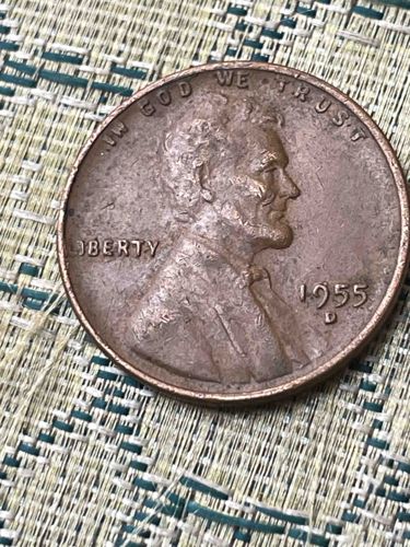 This is a United States one-cent coin, commonly known as a Lincoln Wheat Cent, minted in 1955 at the Denver Mint. The obverse features the right-facing profile of Abraham Lincoln, originally designed by Victor David Brenner. The coin is composed of 95% copper and 5% tin/zinc. Physically, it displays a deep brownish-red patina typical of circulated copper. Notable features include the date '1955' and the 'D' mint mark located directly below the date. The inscriptions 'LIBERTY' and 'IN GOD WE TRUST' are visible, though showing signs of significant wear. The condition of the coin is 'circulated,' evidenced by numerous surface nicks, scratches, and flattened high points on Lincoln's hair and cheek. There is visible pitting and heavy oxidation across the entire surface, suggesting exposure to moisture or environmental factors over time. The edges show slight rounding from use. While the 1955 Denver strike is common, as it is not the famous doubled-die variety often sought by collectors, it remains a historical representative of mid-20th-century American coinage. The craftsmanship represents the standard industrial minting process of the era.