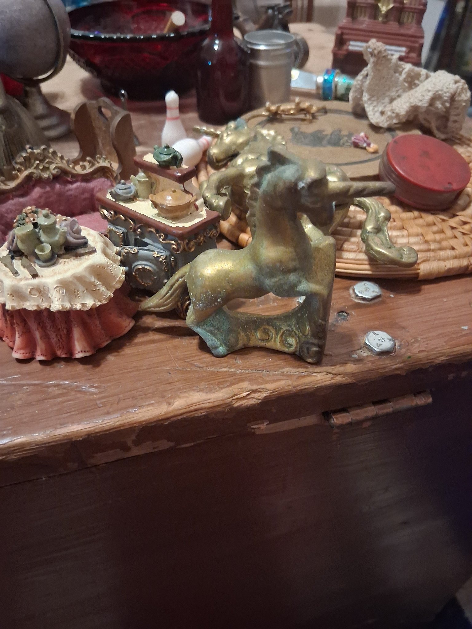 This is a vintage cast-metal unicorn figurine, likely composed of solid brass. The item measures approximately 3 to 4 inches in height and features a rearing or prancing pose with the front legs elevated and physically supported by a decorative scroll-work base. The construction is solid-cast with a visible seam line along the underside and back, suggesting a two-part mold process common in mid-20th-century decorative brassware. The color is a characteristic muted gold-tone, though it displays significant natural oxidation. Noticeable green verdigris (copper carbonate) is present, particularly nestled in the recessed areas of the curly mane, the horn, and the ornate base, indicating prolonged exposure to moisture or high humidity. The surface shows a dull, non-reflective patina and general surface pitting consistent with an age ranging from the 1970s to the 1980s, a period when mythical brass figurines were highly popular. There are no visible maker's marks or signatures on the exterior surfaces; such items were frequently mass-produced in Taiwan or India during the late 20th century. Despite the heavy oxidation, the integrity of the casting remains solid with no apparent cracks or missing appendages, though the horn appears slightly blunt at the tip from wear or manufacturing. The overall craftsmanship is of standard mass-market quality for its era.