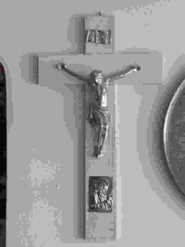 This item is a wall-mounted Christian crucifix featuring a light-colored wooden cross base. The cross displays a vertically oriented stipes and a horizontal patibulum with flat, squared edges, suggesting a mid-to-late 20th-century construction. At the top of the vertical beam is a metallic plate inscribed with 'INRI' (Iesus Nazarenus, Rex Iudaeorum). The central figure of Christ, the corpus, is cast in a silver-toned metal, likely pewter, zinc alloy, or silver-plate, showing a traditional representation with the head bowed toward the right shoulder and legs slightly crossed at the feet. Below the corpus, near the base of the upright beam, is an additional rectangular metal relief plaque, possibly depicting a saint or a specific devotional scene, which is a less common feature in standard mass-produced crucifixes. The craftsmanship appears to be of moderate quality, intended for domestic or parish use. The condition shows age-related darkening of the metal components (patina) and some minor surface wear on the wood. There are no visible maker's marks or signatures in the provided image. The overall style is consistent with Catholic liturgical decor from the 1960s through the 1980s.
