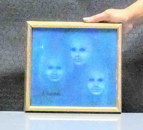 This is an original mixed media painting featuring three ethereal, spectral faces rendered in a monochromatic blue palette. The work is executed using watercolor and paint on a cardboard substrate, measuring approximately 737 x 669 units including the frame. The composition is atmospheric and haunting, with the faces appearing to emerge from a hazy, indigo background. The figures exhibit doll-like or mask-like features with wide, dark eyes and neutral expressions. A visible signature is located in the lower left quadrant, though the artist's name remains unidentified; it appears to read 'B. K...' followed by several script characters. Physically, the piece is housed in a simple, light-colored wooden or metallic frame with a mitered corner construction. The frame shows visible signs of age and wear, including scuffing and minor finish loss along the edges. The glass cover displays some surface dust and potential light reflections, but protects the medium beneath. The style is reminiscent of mid-to-late 20th-century figurative surrealism, characterized by a dreamy, blurred application of pigment which creates a sense of depth and mystery. The craftsmanship reflects a studied approach to light and shadow within a limited color field.