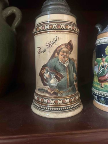This is a traditional German ceramic beer stein, likely dating from the late 19th to early 20th century. The vessel is constructed from salt-glazed stoneware with a creamy, off-white background. It features a central polychrome transfer or hand-painted illustration of a jovial man in traditional teal clothing, holding a smaller lidded stein. Above the figure is the German celebratory phrase 'Dein Wohl!' (Your Health!) in black Gothic script. The body is framed by top and bottom relief bands containing a repetitive oval and dot geometric pattern in shades of brown and tan. The stein is fitted with a domed pewter lid featuring a tiered design and an ornate thumb lift. The metal shows a dark, age-appropriate patina but remains intact. The ceramic surface appears to be in good condition with minor surface grime near the base, typical of shelf storage. The craftsmanship suggests a commercial production from a known region like the Westerwald. Overall, the piece displays a high level of detail in the central graphic and well-preserved structural integrity, making it a classic example of tavern ware or commemorative breweriana from the historicist period.