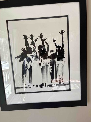 This item is a contemporary monochromatic art print by artist Randy Masser, presented in a formal professional framing. The composition features a group of silhouetted figures with their arms raised against a stark, high-contrast background. The stylistic approach utilizes heavy contrast and graphic simplification, reminiscent of mid-to-late 20th-century pop art or social realism. The print is executed on high-quality paper with visible stippling or halftone textures in the mid-tones. It is housed in a clean-lined black gallery frame that complements the work's stark aesthetic. The piece is matted with a crisp white archival mat containing a thin black decorative pinstripe or fillet that draws the eye toward the central image. A signature, presumably that of Randy Masser, is visible in the lower right margin of the image area. The condition appears excellent with no visible signs of foxing, fading, or moisture damage, although there are minor reflections on the protective glass. The craftsmanship of the framing suggests it was prepared for professional display. Its style aligns with modern minimalist interiors and contemporary figurative art collections.