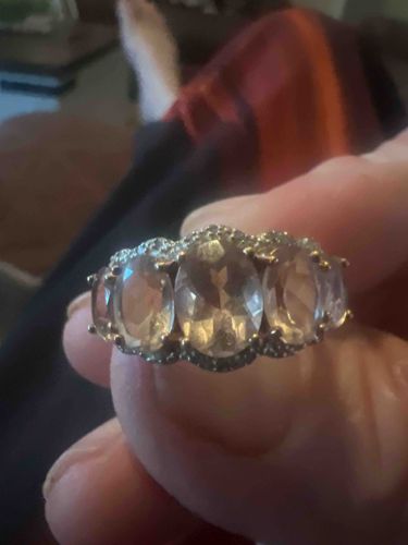 This is a statement-style fashion ring featuring a prominent five-stone linear arrangement of oval-cut gemstones. The central stone is the largest, flanked by slightly smaller graduated oval stones on either side, all secured by traditional prong settings. The metal appears to be a white-tone material, likely sterling silver or white gold-plated brass, given the style and luster. Each of the five primary stones is surrounded by a micro-pave or petite halo of small, clear accent stones, which also appear to continue onto the shoulders of the band. The primary gemstones exhibit a pale, translucent quality with a slight pinkish or lavender tint, suggesting they may be rose quartz, morganite, or possibly high-quality cubic zirconia or faceted glass. The construction shows a multi-layered head design to support the gallery of stones. Regarding condition, the metal shows some minor dullness or surface patina consistent with moderate wear, and there is a noticeable presence of dust or skin oils around the facet edges, which is typical for pre-owned jewelry. The facets on the center stone are sharp, though the transparency indicates a lower refractive index than diamonds. This piece reflects a contemporary 'glamour' style, likely manufactured within the last 10-15 years as a piece of bridge or costume jewelry.