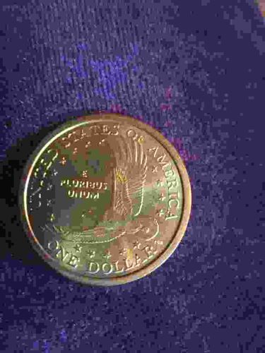 This is a United States Sacagawea Dollar coin, typically produced starting in the year 2000. This specific image shows the reverse (tails) side of the coin. The design features a soaring bald eagle surrounded by 17 stars, representing the number of states in the Union at the time of the Lewis and Clark expedition. The text 'UNITED STATES OF AMERICA', 'E PLURIBUS UNUM', and 'ONE DOLLAR' is clearly embossed. The coin is composed of a copper core clad with a manganese brass coating, which gives it its signature golden or 'brass' appearance. Measuring 26.5mm in diameter with a plain, smooth edge, this specimen shows moderate signs of circulation and age. There is visible surface wear on the high points of the eagle's wings and some light scratching or bag marks on the field of the coin. A significant amount of tarnishing or 'toning' is present, with shifts toward darker copper and brownish hues, particularly along the bottom rim and near the eagle's tail. This patina suggests the coin has been exposed to the environment rather than being stored in a mint-state protective casing. The overall strike quality appears standard for business strikes intended for general circulation.