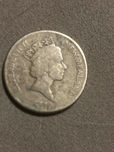 This is a circular metallic coin from New Zealand, minted during the reign of Queen Elizabeth II. The obverse side features the right-facing young head portrait of Her Majesty known as the first effigy, where she wears a laurel wreath. The inscriptions 'ELIZABETH II' and 'NEW ZEALAND' encircle the bust along the rim. Based on the material appearance and the effigy type, the coin is likely composed of cupro-nickel, which succeeded silver for this denomination. The date at the bottom is partially obscured but appears to be from the mid-20th century, typically between 1953 and 1965 before decimalization. The coin exhibits significant circulation wear, showing a dull grey patina, flattening of high points in the portrait's hair and crown, and numerous surface scratches and pitting. The edge is likely reeded, though not fully visible from this angle. The strike quality is standard for mass-produced currency of the British Commonwealth. It serves as a historical artifact of New Zealand's pre-decimal monetary system and the early Elizabethan era.