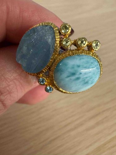 This is a vibrant multi-gemstone statement ring featuring a combination of raw and polished stones set in a gold-finished metal, likely gold-plated sterling silver or high-karat gold vermeil. The primary focal point consists of two large stones: a polished oval larimar cabochon with characteristic white and light blue marbling, and a rough-cut, faceted blue lace agate or chalcedony with a matte, crystalline surface. Accompanying these are seven smaller, round-faceted accent stones—four yellowish-green peridots clustered at the top and two light blue topazes at the bottom. The metalwork features a distinctive textured, 'milgrain-style' or vertical-ribbed bezel surrounding the main stones, giving it a handcrafted, bohemian aesthetic. The construction appears sturdy, with the smaller stones set in individual bezels. The ring is in good contemporary condition with no visible cracks in the stones, though the raw cut of the darker blue stone contains natural surface irregularities. The style is indicative of modern artisan jewelry from the early 21st century, prioritizing organic shapes and natural stone textures.