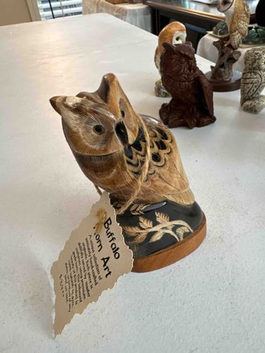 This is a hand-carved decorative figurine depicting an owl, specifically crafted from water buffalo horn. The piece measures approximately 4 to 6 inches in height and features a rich, organic color palette ranging from deep obsidian black at the base to honey-amber and translucent cream tones towards the top of the head. The organic material exhibits a fibrous texture with natural striations, characteristic of keratin-based horn. The craftsmanship includes intricate incised lines to simulate facial feathers around the eyes and a scalloped pattern on the wings. Notable features include a polished black base with etched foliate (leaf) motifs and a light-toned wooden pedestal. A manufacturer tag is present, identifying it as part of a 'Buffalo Horn Art' collection, which notes that the color variations are inherent to the natural material rather than dyes. The condition appears excellent with a high gloss finish, though there is a small light-colored chip or natural inclusion visible on the left 'ear' tuft. Likely mid to late 20th century in origin, it represents a popular style of folk art often produced in Southeast Asia.