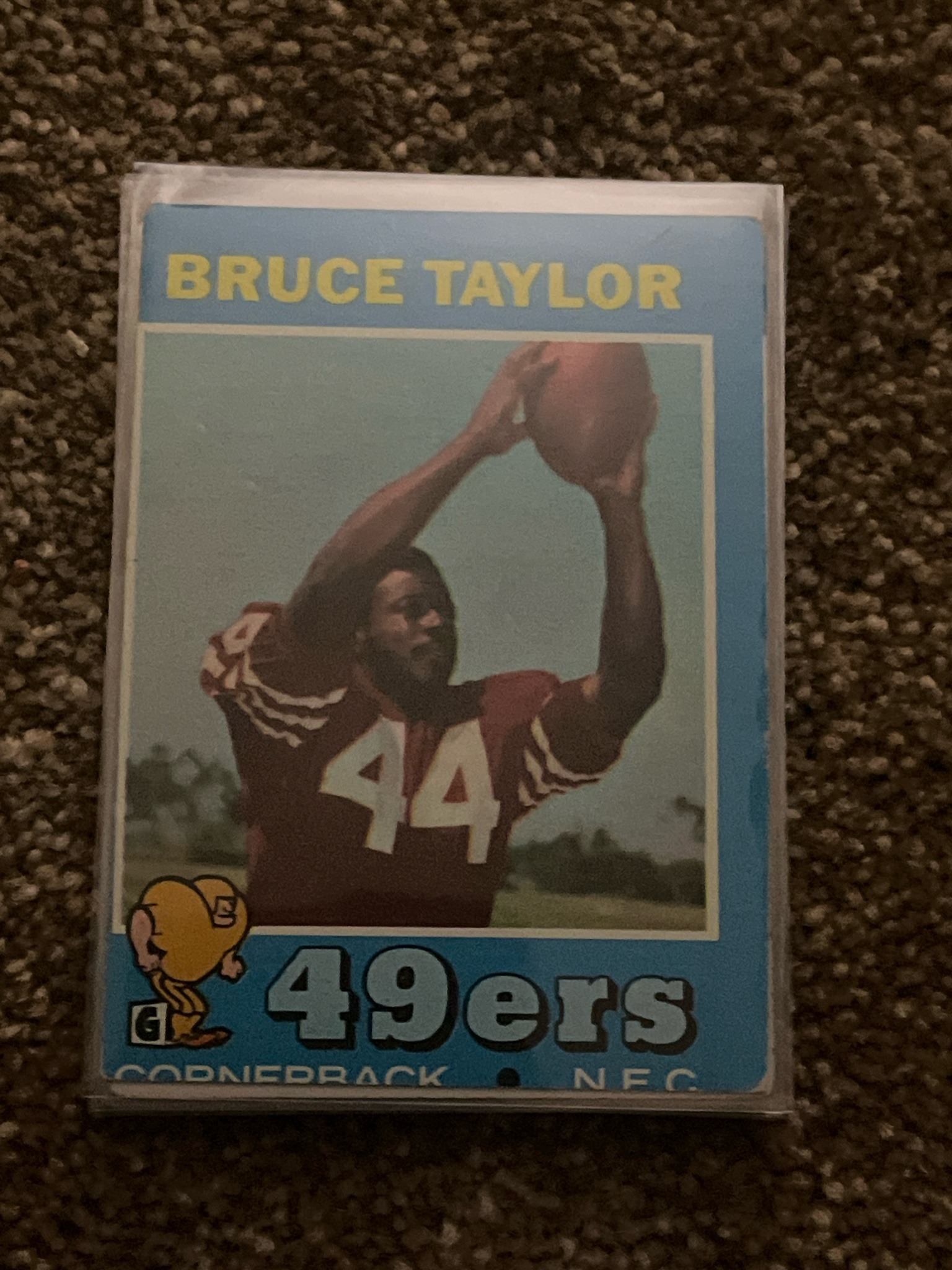 This is an original 1972 Topps trading card featuring Bruce Taylor (Cornerback) of the San Francisco 49ers. The card displays the iconic 1972 design characterized by a blue border, yellow block lettering for the player's name at the top, and '49ers' in a large, stylized bubble font at the bottom. A signature feature of this specific year's set is the small cartoon character illustration in the lower-left corner—in this case, a football-headed player in a stance. The photograph shows Taylor in his red and white 49ers jersey with number 44, holding a football overhead against a daytime field backdrop. Regarding condition, the card is housed in a clear protective sleeve. The centering appears slightly shifted toward the top and right edges. There is visible whitening and soft wear on the corners, particularly the bottom right, which is common for vintage card stock of this era. The surface colors remain relatively saturated, though there are minor indications of edge wear along the blue border. This card represents a significant period in NFL history and Topps manufacturing, notable for its bold, graphic aesthetic and high-quality lithography for the early 1970s.