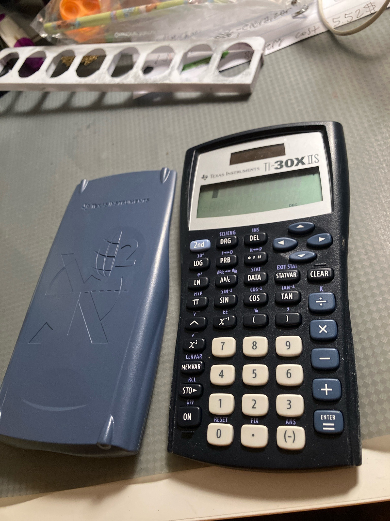 This is a Texas Instruments TI-30XIIS scientific calculator, a widely used educational tool for middle and high school mathematics. The device features a two-line liquid crystal display (LCD) housed in a dark blue or midnight blue plastic chassis with a solar panel strip for auxiliary power. The construction is durable molded plastic with rubberized or hard plastic buttons in a multi-color scheme: white for numeric keys, blue for primary functions, and black for secondary operations. It includes a matching snap-on hard protective cover with the Texas Instruments logo and a globe graphic embossed on the front. Physically, the item shows signs of minor cosmetic wear and dust accumulation consistent with regular classroom use. The faceplate displays the brand 'Texas Instruments' and the model name 'TI-30XIIS' clearly. The keys appear responsive and well-spaced, indicating standard ergonomic design for student use. As a ubiquitous modern electronic device manufactured in the late 20th and early 21st centuries, it represents reliable consumer-grade industrial design.