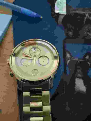 This item is a contemporary Movado BOLD collection chronograph wristwatch featuring a distinctive large-scale aesthetic. The watch is constructed from polished stainless steel with a substantial circular case and a matching link-style bracelet. The dial is a monochromatic silver-toned sunray finish, characterized by the iconic Movado single dot at the 12 o'clock position, which represents the sun at high noon. This specific model features a three-register chronograph layout with sub-dials positioned at 3, 6, and 9 o'clock, often tracking seconds, minutes, and hours. The hands are sleek, tapered batons. In terms of condition, the polished bezel and case show minor surface scratches and faint scuffing indicative of regular use, particularly around the 6 o'clock edge and the lugs. The crystal appears intact but may have light micro-abrasions under magnification. The bracelet links show typical friction wear at the joints. Based on the design, it is a quartz movement timepiece produced within the last 5-10 years. It lacks numerical markers, emphasizing a minimalist, high-fashion modern style. The craftsmanship is consistent with mid-range luxury fashion watches, focusing on bold visual presence and a heavy, durable feel.