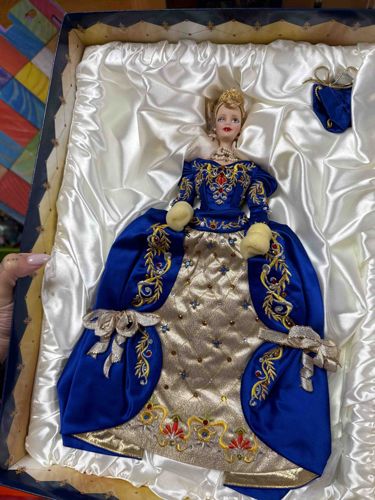 This is a limited-edition Faberge Imperial Elegance Barbie, a highly collectible porcelain doll released by Mattel in 1997. The doll features a fine, hand-painted bisque porcelain body with sophisticated facial detailing, including rooted eyelashes and a meticulously styled upswept high-bun blonde hairstyle. She is dressed in an opulent, heavy royal blue velvet and gold satin gown inspired by the grandeur of the Russian Imperial court. The bodice is intricately embroidered with gold thread and accented with hand-sewn beads and red crystals. The skirt features a gold quilted panel adorned with more beads and patterns that mimic the craftsmanship of Faberge eggs. She wears faux-fur cuffs, a multi-strand faux-pearl choker with a ruby-like center stone, and matching drop earrings. The doll appears to be in its original presentation box, lined with ruched white satin, which includes a blue velvet drawstring pouch likely containing a certificate of authenticity or a miniature Faberge egg accessory. The condition looks excellent with no visible chips to the porcelain or fading to the fabrics, suggesting it has been kept as a display or collector's piece. This doll represents a high-end collaboration between Mattel and the House of Fabergé, characterized by superior craftsmanship and premium materials designed for the adult collector market.