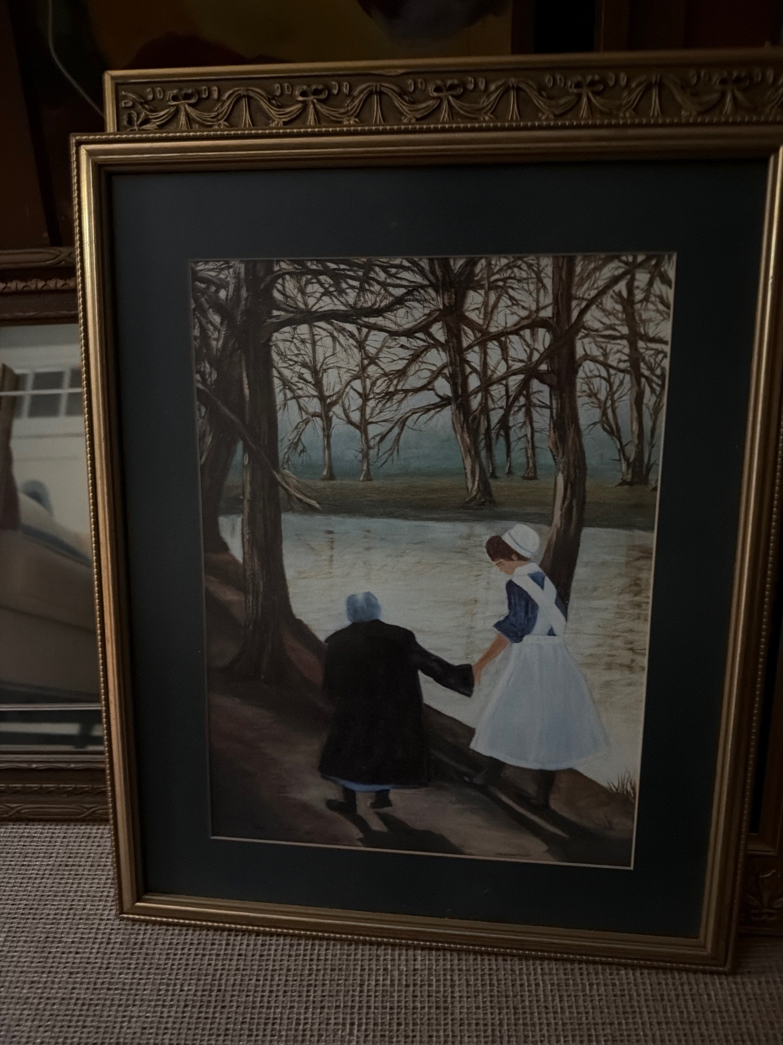 This is a framed vertical painting depicting a poignant outdoor scene of an elderly woman being assisted by a nurse or caregiver alongside a river or body of water. The artwork appears to be a Gouache or Tempera painting on paper, characterized by its matte finish and opaque layering. The composition focuses on two figures shown from behind: one in a dark black coat and head covering, and the other in a traditional mid-20th-century nurse’s uniform featuring a blue dress, white apron with cross-back straps, and a white nurse's cap. They walk along a dark path under the canopy of bare, skeletal winter trees rendered in dark browns and blacks, contrasted against a hazy, atmospheric background. The palette is dominated by somber earth tones, muted blues, and stark whites. The work is professionally matted in a dark forest green or charcoal grey mat board and housed in a thin, contemporary gold-toned metal or gilded wood frame with a fluted profile. While no artist signature is immediately visible in the lower corners through the glazing, the style suggests a late 20th-century folk-art influenced or narrative realist approach. The condition appears stable with no visible foxing, though some light reflections on the glass suggest it is framed under standard non-UV glass. The frame exhibits minor surface wear consistent with age and handling.