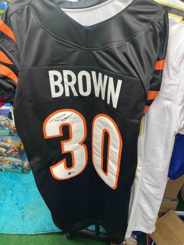This is a contemporary Cincinnati Bengals replica jersey featuring the name 'BROWN' and the number '30' on the back, identified with current running back Chase Brown. The garment is primarily black with vibrant orange and white accents characteristic of the team's branding, including orange tiger-stripe details on the sleeves. The numerals are constructed with a tackle twill application, featuring white centers and a thick orange outline, while the nameplate uses screen-printed or applied white block lettering. A significant feature is the silver ink autograph located on the top curve of the number '3'. The signature appears fluid and is placed prominently on the jersey's rear. The jersey is made of synthetic athletic mesh and solid polyester panels. The item appears to be in excellent condition with no visible snags, stains, or fraying, originating from the 2023-2024 era. While no COA is visible in the frame, the marker pressure and stroke style are consistent with authentic player signings. The garment's construction quality reflects a standard retail or custom fan-shop replica style rather than on-field authentic specifications.