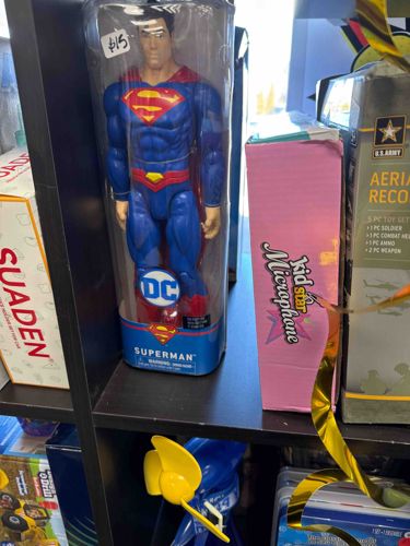 This is a mass-produced 1/6 scale (approximately 12 inches tall) Superman action figure, likely manufactured by Spin Master under license from DC Comics and Warner Bros. The figure is constructed from molded plastic with a matte finish, featuring the classic blue, red, and yellow color scheme. It depicts Superman in a modern suit design with high muscular definition and the iconic 'S' shield on the chest and belt. The figure features limited articulation, typically at the neck, shoulders, and hips. It is presented in its original retail 'Power Box' packaging, which consists of a clear plastic blister wrap and an open cardboard base that prominently displays the DC logo and character name. The packaging shows signs of shelf wear, including minor scuffs on the plastic and a handwritten '$15' price sticker on the top front. The condition of the internal figure appears mint and unused, though the packaging serves as a budget-oriented display rather than a collector-grade sealed box. This modern era toy (likely produced between 2020-2023) represents a common retail-tier collectible rather than a vintage or limited-edition piece.