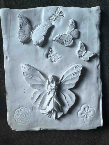 This item is a rectangular relief plaque made from white plaster or a similar air-dry clay casting material. It features a prominent high-relief figure of a winged fairy at the bottom center, flanked by several smaller butterflies of varying sizes and two circular floral motifs. The fairy figure exhibits detailed wing patterns with swirls at the tips, while her form represents a classic fantasy style with a flowing gown. The plaque has an irregular, hand-finished edge, giving it a somewhat rustic or artisanal appearance. There are four distinct butterflies in high relief and two smaller butterfly impressions indented into the surface. The overall surface is matte white with some visible texture, indicating it may be unsealed or in a raw bisque state. Condition-wise, the piece shows some minor surface dirt and slight scuffing, particularly around the edges and on the raised portions of the design. Several small indentations and pockmarks are visible, which are common in plaster-based handicrafts due to air bubbles or handling during the drying process. There are no visible maker's marks or signatures, suggesting this is a modern decorative piece likely from a hobbyist kit or a small batch studio production. The style is late 20th to early 21st-century modern fantasy art.